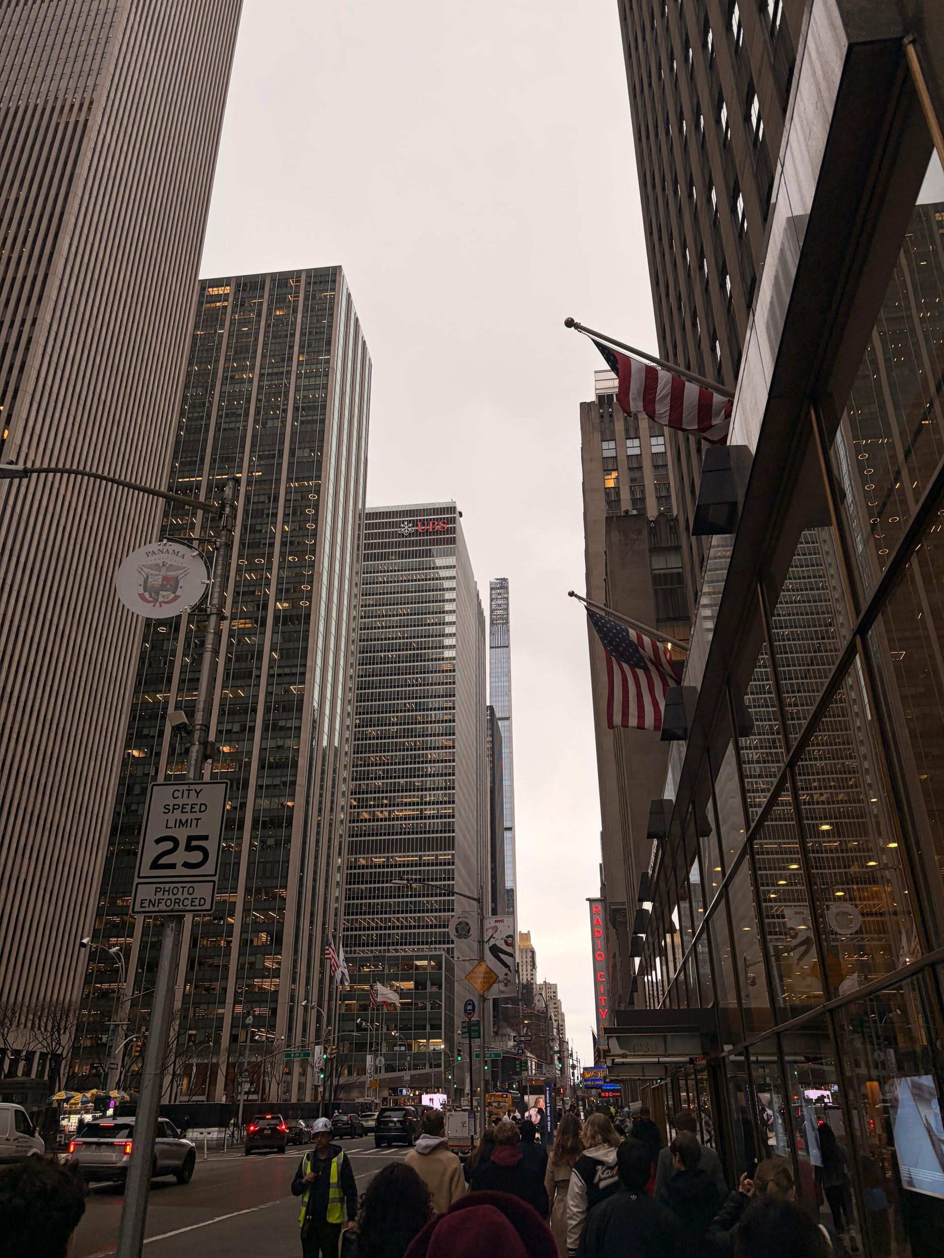 Nach dem Frühstück begann der Tag mit einem Ausblick von ganz oben. Wir begaben uns bei noch leichtem Niesel zum Rockefeller Center. Bevor wir mit dem Fahrstuhl nach oben fuhren, gab es einen beeindruckenden 5-Minuten-Film über die Geschichte des Rockefeller Centers. Dieser Film wurde durch plötzlichen Schneefall im Raum geprägt, der uns alle für einen Moment staunen ließ. Oben gab es dann einen phänomenalen Ausblick auf die Stadt.