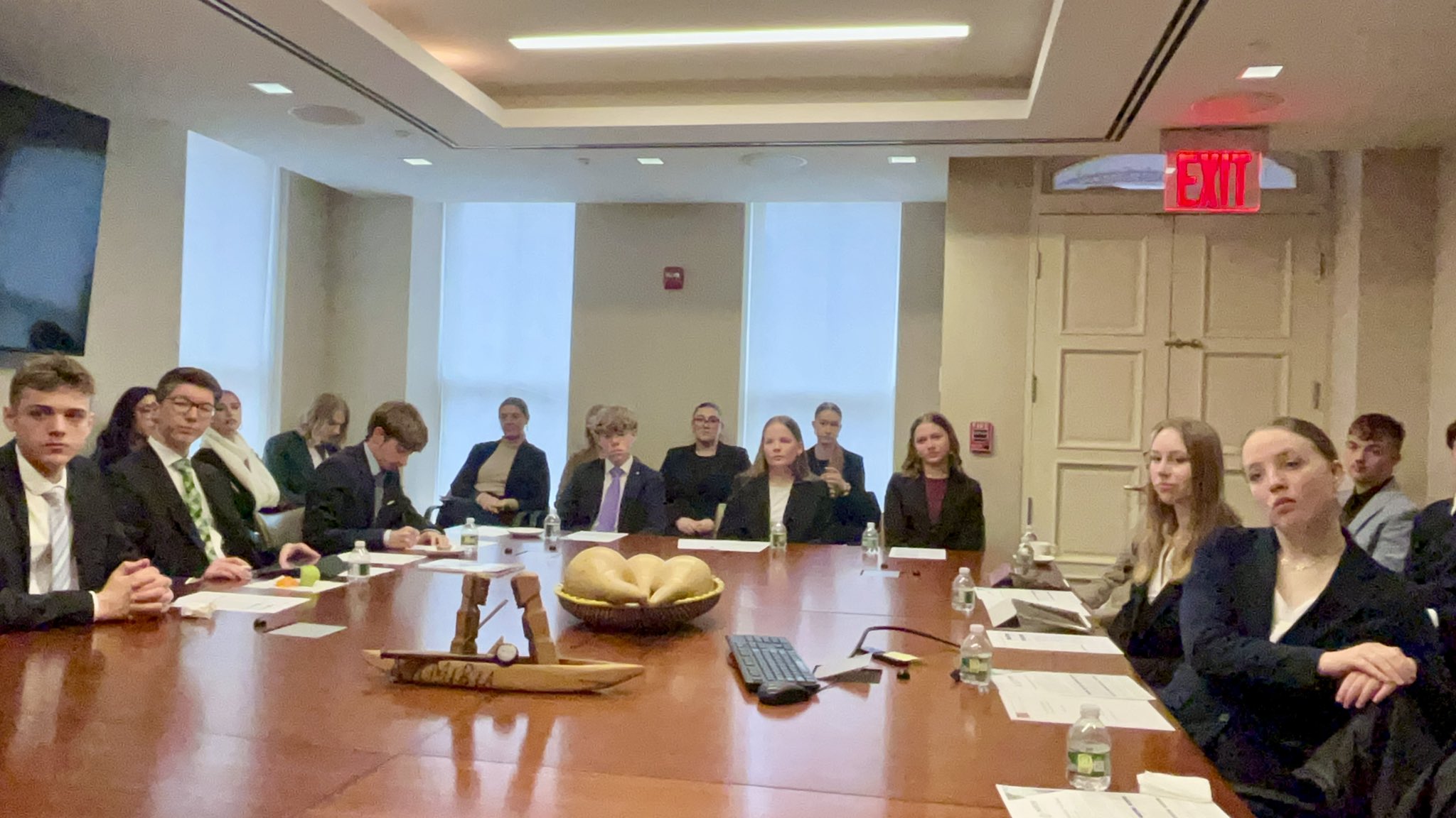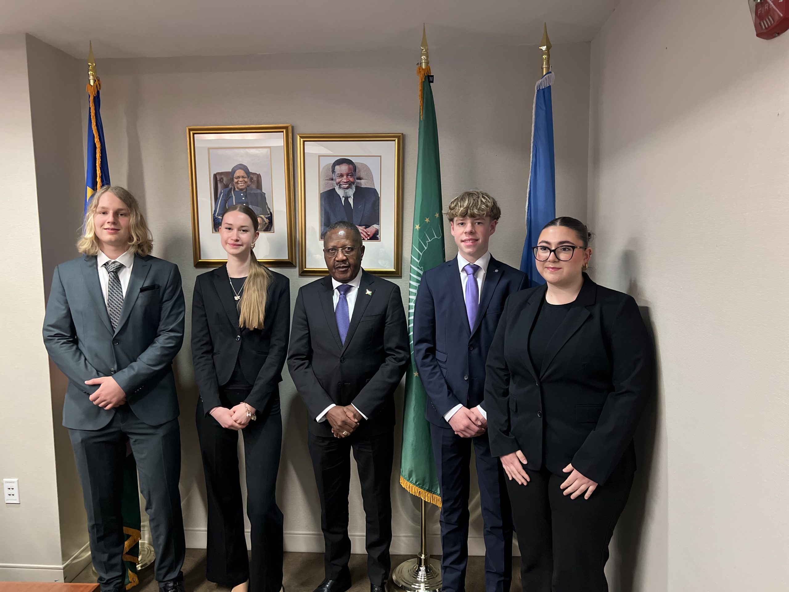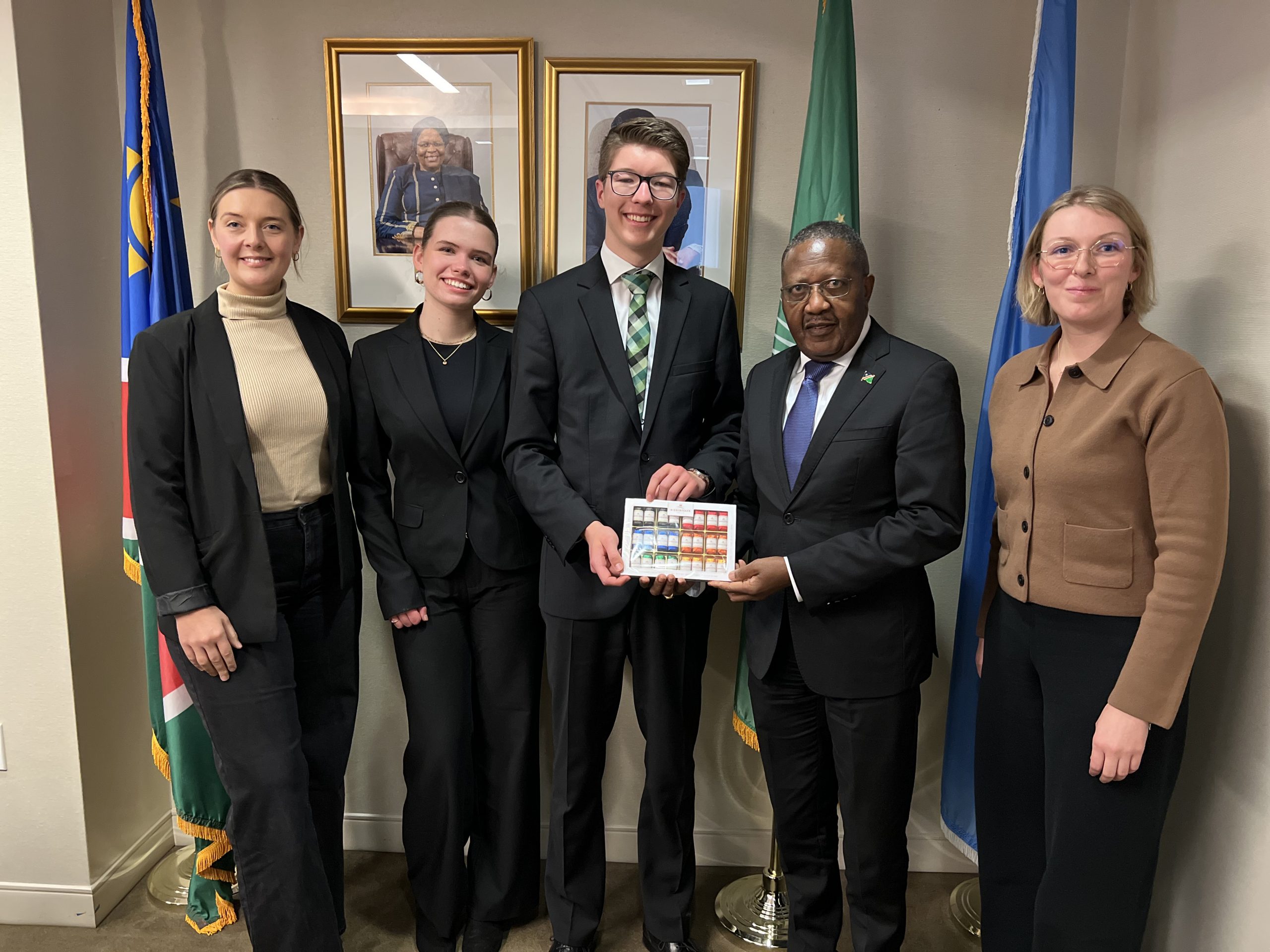 Danach machten wir uns auf dem Weg zurück zum Hotel, um uns ein letztes Mal aufs Mission Briefing mit Namibia vorzubereiten, unseren ersten politischen Termin. Unser Weg zur Ständigen Vertretung Namibias bei der UN begann mit leichtem Hagel. Wir ließen uns nicht unterkriegen und liefen – trotz der Option Bahn zu fahren – weiter zu Fuß durch die Stadt. Angekommen wurden wir sehr freundlich empfangen und unterhielten wir uns für knapp zwei Stunden mit Penda Naanda, dem Ständigen Vertreter Namibias, und seinem gesamten Team. Wir konnten Fragen stellen und mit den Antworten unser Wissen über die bevorstehenden Konferenzen erweitern. Einige Themen waren z.B. SDGs (Sustainable Development Goals), Migration und internationale Zusammenarbeit.