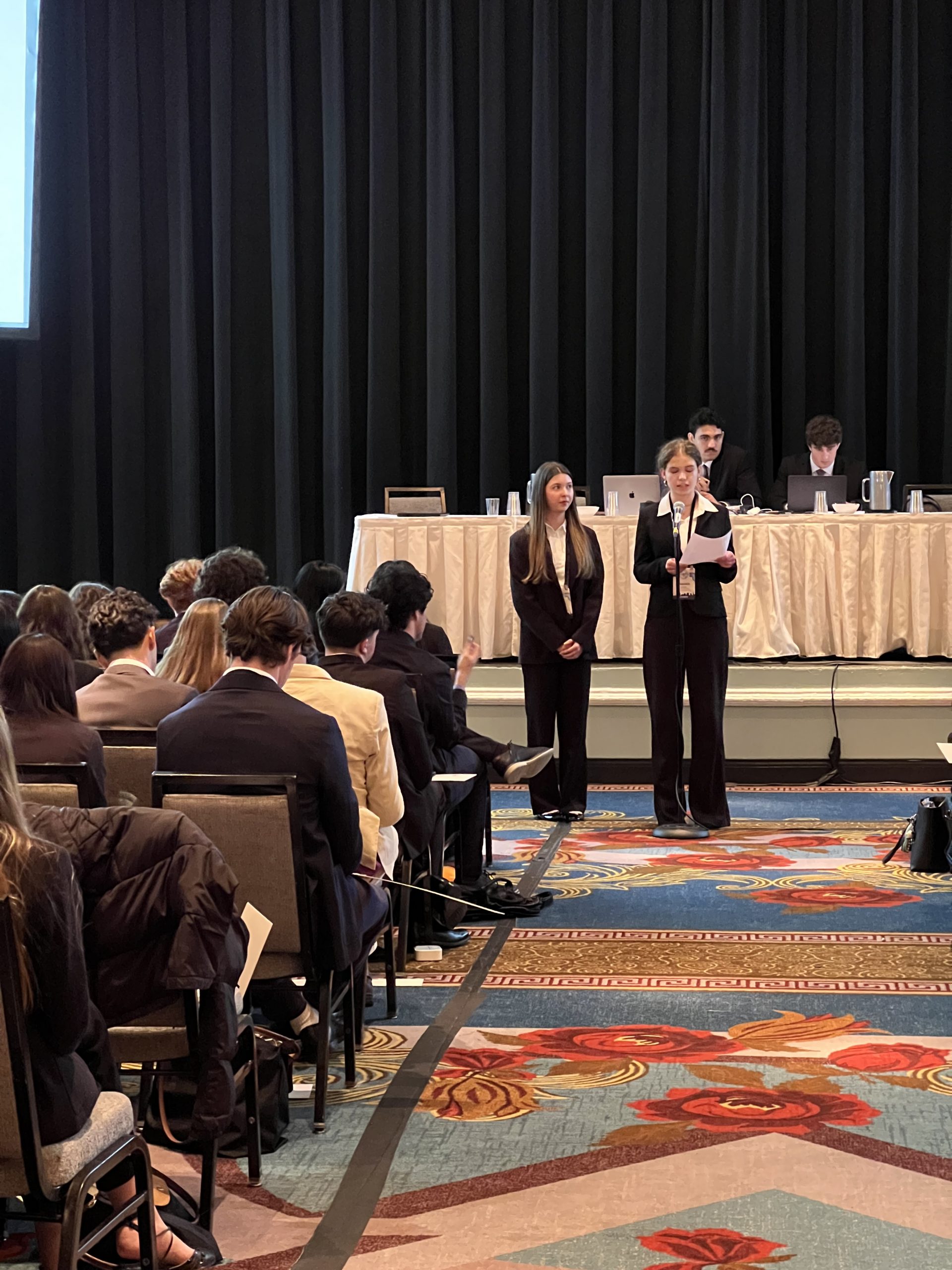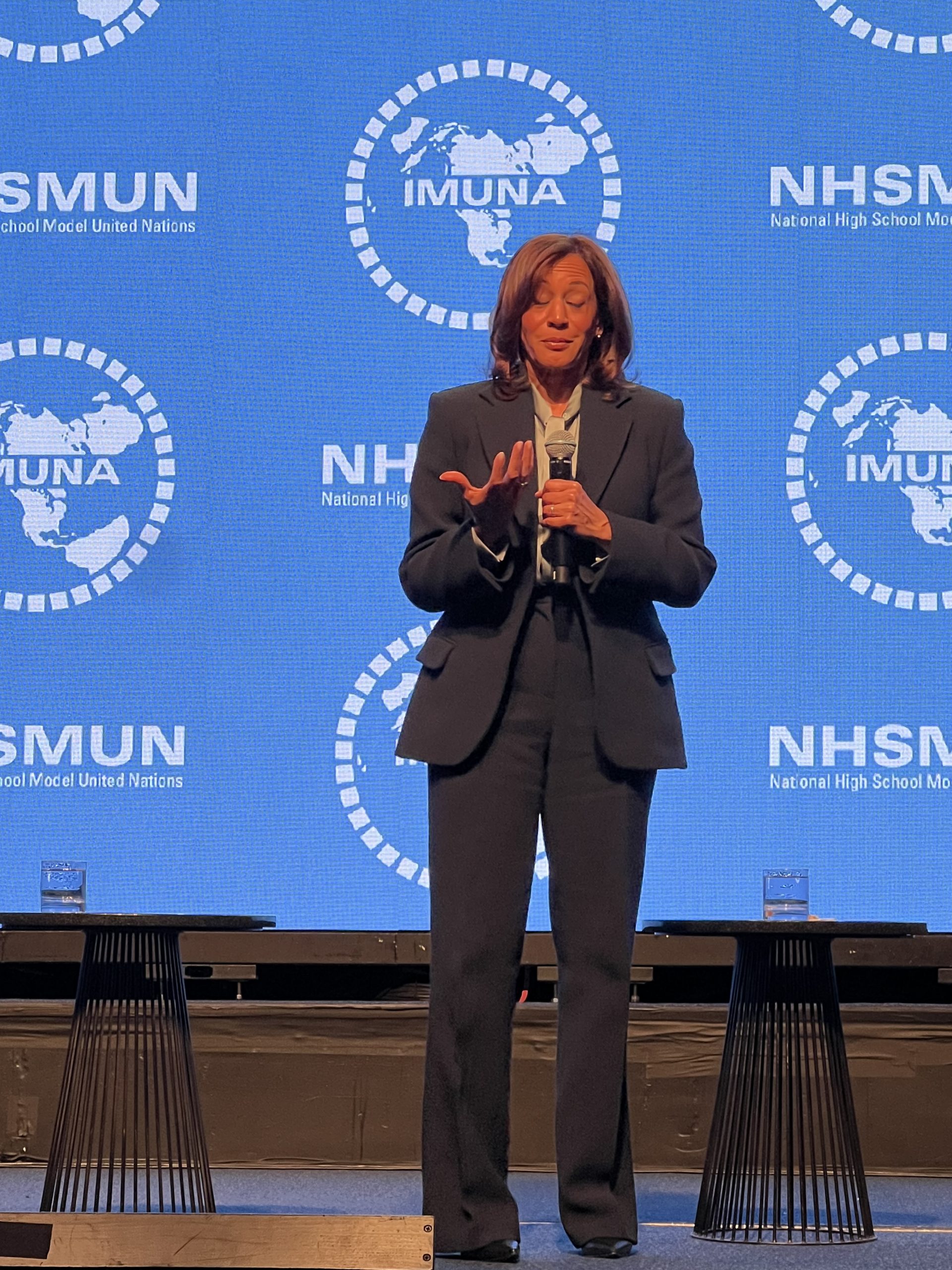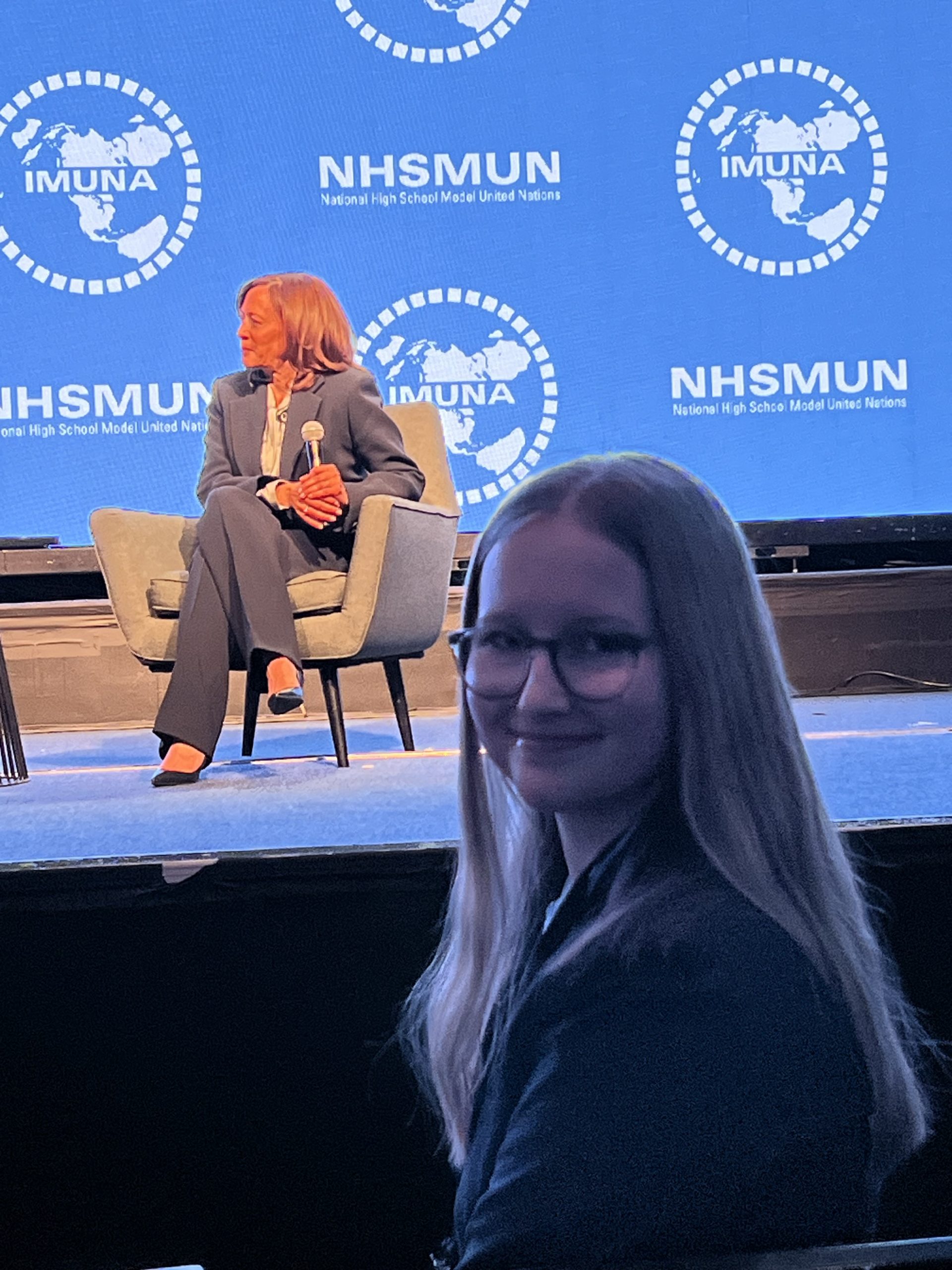 Heute war ein langer Tag! Vormittags haben wir die freie Zeit genutzt, um frühstücken zu gehen und den Times Square näher zu erkunden. Da durfte ein Abstecher in einen überteuerten Souvenirshop und ein Mittagessen bei Raising Cane‘s natürlich nicht fehlen. Beides definitiv einen Besuch wert! Mittags sind wir zum Mission Briefing mit Portugal gegangen, wo wir uns mit zwei erfahrenen Praktikantinnen der United Nations für eine knappe Stunde näher über ihren persönlichen Werdegang, die Europäische Union und die portugiesische Kultur ausgetauscht haben. Danach haben wir uns im Umkreis des Hilton (des Konferenzgebäudes) für die bevorstehende lange Nacht gestärkt. Es stand nämlich die Opening Ceremony an, bei der wir anfangs von einer sehr unterhaltsamen tänzerischen Darbietung mit Gesang überrascht wurden. Das hat die seriöse Stimmung etwas aufgelockert und uns auf den wahren Star des Abends aufgeregt hinfiebern lassen: Die einzig wahre und unglaubliche Kamala Harris! Wir haben sie mit tosendem Applaus begrüßt und hingen an ihren Lippen, während sie einige Fragen beantwortet hat, die im Vorraus eingeschickt werden konnten. Darunter sogar eine von Anni, die deswegen in der ersten Reihe sitzen durfte! Nach diesem äußerst inspirierenden Auftritt trennten sich unsere Wege, denn die erste Komitteesitzung sollte beginnen. So hörten und hielten wir schon die ersten Reden, bildeten Allianzen und lernten vor allem Schüler:innen aus verschiedensten Ländern kennen, die alle für ein Ziel zusammengekommen sind. Als wir schließlich um 23:00 Uhr fürs Erste fertig mit Diplomatie und internationaler Zusammenarbeit waren, waren wir uns einig, wir würden eifrig und voller Vorfreude in den nächsten Tag starten. Doch zuvor mussten wir noch in Annis Geburtstag reinfeiern!
