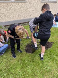 Auch wenn es sich „nur“ um einen Baum handelt – wir sind überzeugt: Jeder Baum zählt! Mit vereinten Kräften der SV, einiger Klassensprecherinnen und Klassensprecher des siebten Jahrgangs sowie unserer Garten-AG wurde der junge Baum eingepflanzt und herzlich willkommen geheißen.